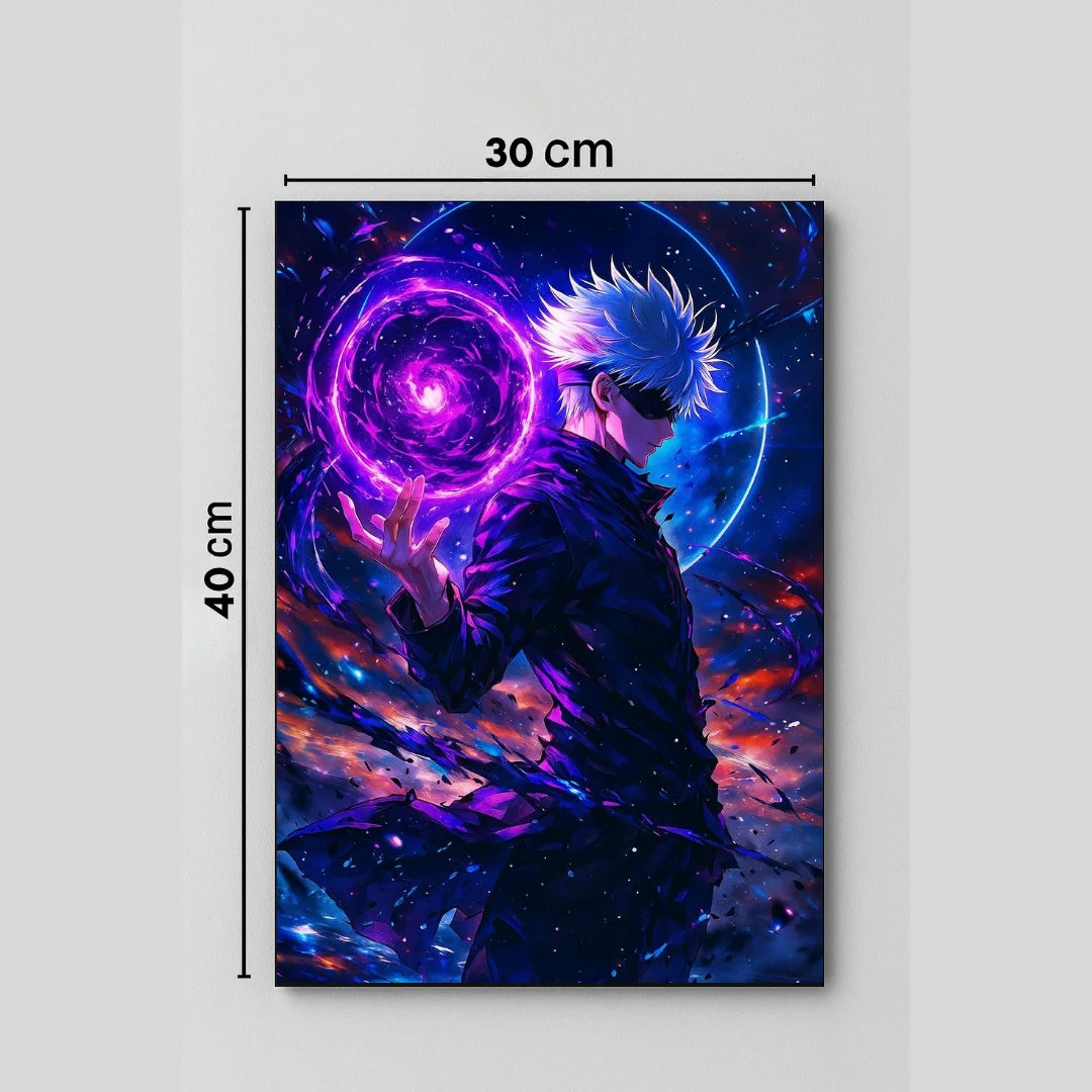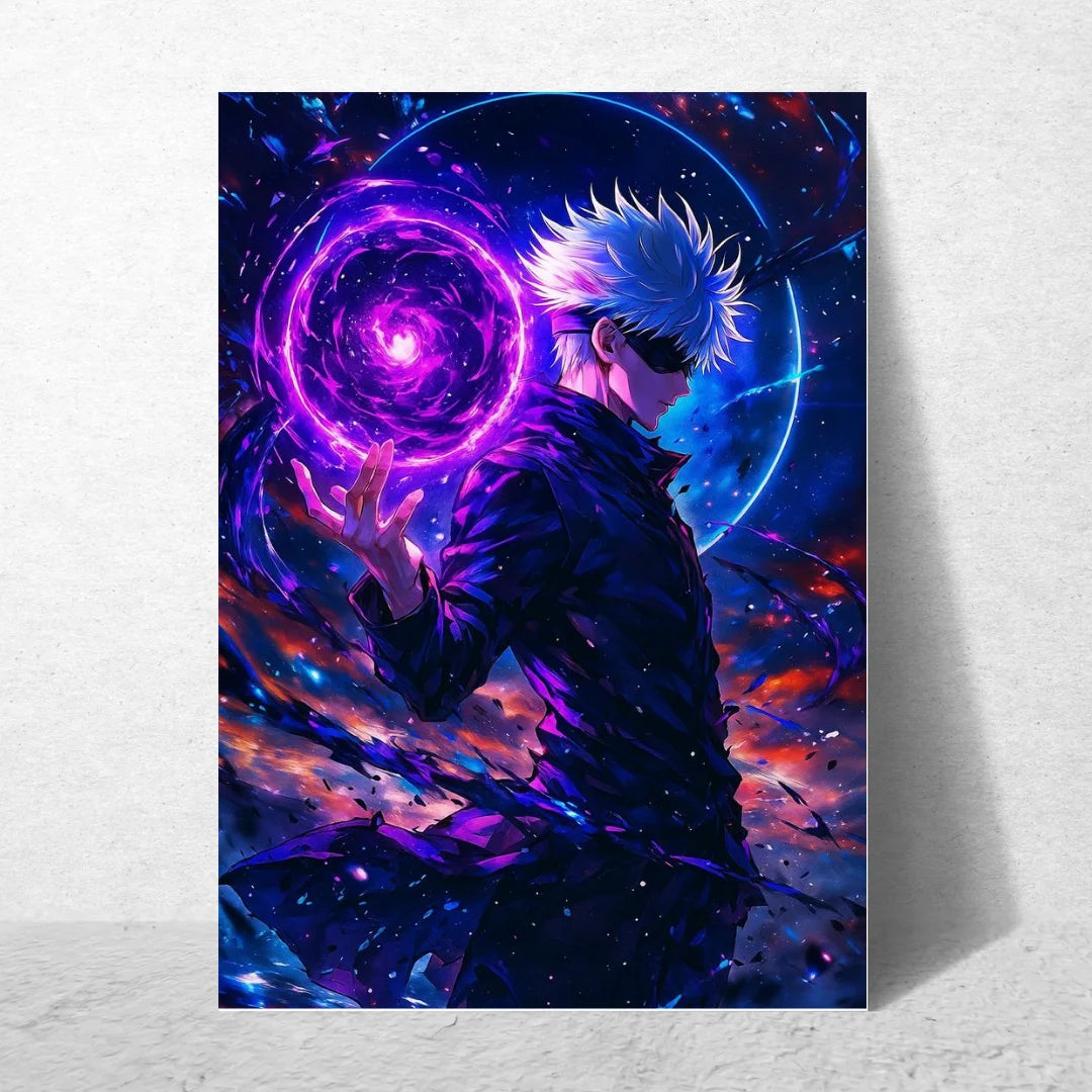 Este espectacular cuadro decorativo captura la esencia del dominio absoluto de Satoru Gojo. La obra representa su icónica técnica "Vacío Púrpura" con una paleta de colores cósmicos que resaltan su energía ilimitada. Es una pieza de arte moderno que transmite una sensación de poder, control y misterio infinito.