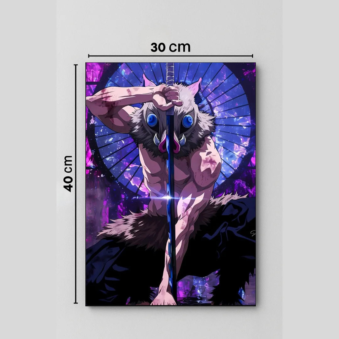 Este cuadro decorativo captura la esencia indomable de Inosuke Hashibira. Su pose desafiante y su icónica máscara de jabalí destacan sobre un hipnótico fondo cósmico en tonos púrpuras, representando su estilo de combate impredecible y su naturaleza instintiva.