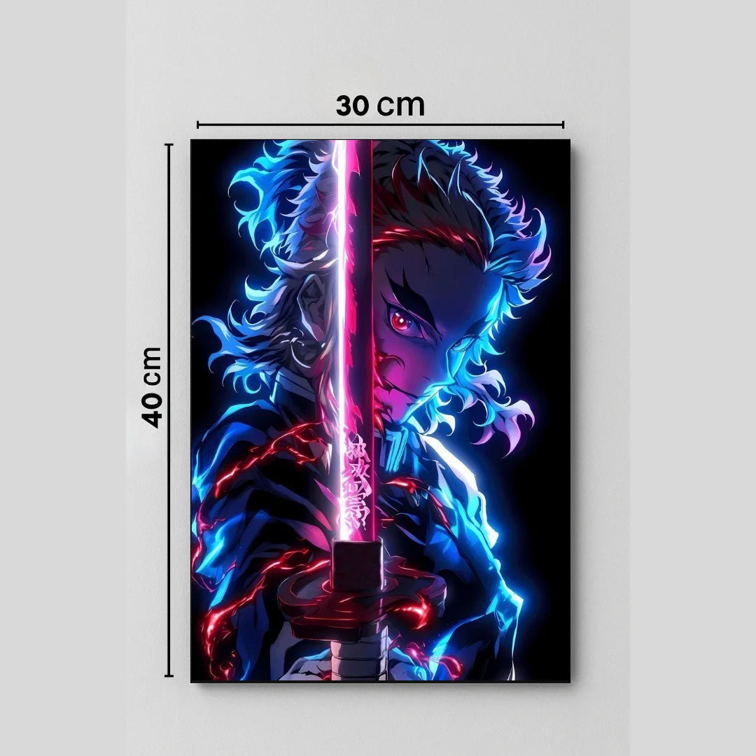 Este cuadro decorativo fusiona la pasión inquebrantable de Rengoku con una estética ciberpunk. La brillante luz roja de su espada contrasta con el aura azul que lo envuelve, simbolizando su ardiente voluntad y su serena determinación. Es una pieza de arte moderno que reinterpreta a un héroe legendario.